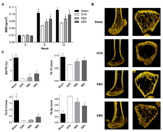 OVX mice present a reduced bone mass and quality, with significantly decreased BMD and bone mineral content (BMC) [46]. Based on the in vitro study, the anti-osteoporotic effects of KB in OVX mice were investigated. Seven-week-old female ddY mice underwent either an ovariectomy or sham-operated surgery (Sham). After surgery, the mice were divided into four groups: (1) Sham, (2) OVX control, (3) OVX treated with 2 mg/kg/day of KB, and (4) OVX administrated with 5 mg/kg/day of KB (n = 5 in each group). The treatments were orally administered to the mice for 12 weeks, and the BMD and BMC of the right femur were measured at 0, 6, and 12 weeks using a PIXI-mus bone densitometer (Figure 6A). At the end of the in vivo experiment, transverse microcomputed tomography (micro-CT) images of the right femur were scanned (Figure 6B), and the micro-CT images were analyzed for trabecular bone structural properties, including bone volume (BV/TV), trabecular thickness (Tb.Th), trabecular number (Tb.N), and trabecular spacing (Tb.Sp) (Figure 6C).