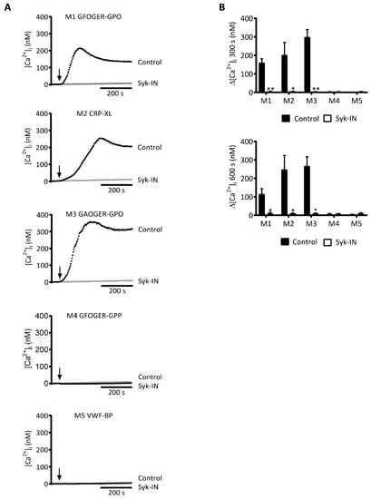 Syk inhibition affecting platelet Ca2+ rises by collagen peptides with (GPO)n motif. Fura-2-loaded platelets in 96-well plates were pre-incubated with Syk-IN (5 µM) or left untreated before stimulation with collagen peptide (M1-5, 10 µg/mL). Changes in [Ca2+]i were recorded over time per well-plate row by ratio fluorometry using a FlexStation 3. Peptides were injected into wells at 60 s (arrow) and reached platelets in a diffusion-limited way. (A) Calibrated [Ca2+]i traces recorded over 600 s in the absence (black, control) or presence (gray) of a Syk inhibitor. Traces are representative of three experiments. (B) Quantification for M1-5 of increased [Ca2+]i at 300 s (top graph) or 600 s (bottom graph). Means ± SEM (n = 3). Paired Student’s t-tests; * p < 0.05, ** p < 0.01.