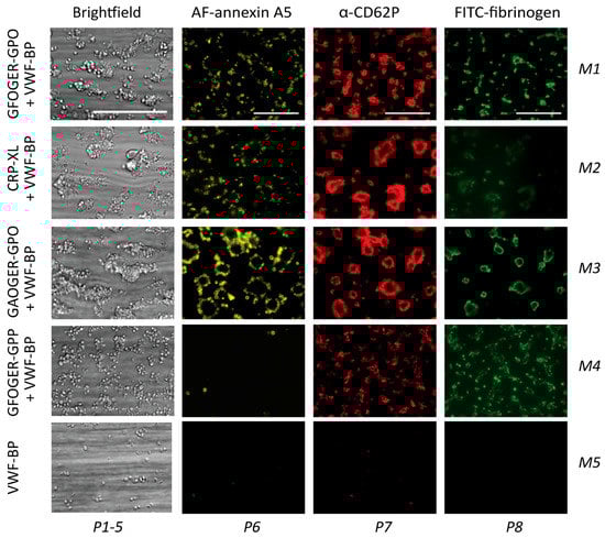 Thrombus formation on immobilized collagen peptides with or without a (GPO)n motif. Whole blood was perfused over microspots M1 (GFOGER-GPO + VWF-BP), M2 (CRP-XL + VWF-BP), M3 (GAOGER-GPO + VWF-BP), M4 (GFOGER-GPP + VWF-BP), and M5 (VWF-BP), with assumed platelet adhesion via GPIb, GPVI, and/or integrin α2β1, as in Table 1. The wall-shear rate was 1000 s−1, with a perfusion time of 3.5 min. Representative bright-field microscopic images at the end stage are shown for an analysis of platelet deposition (parameter P1) and thrombus characteristics (P2–5). In addition, end-stage three-color fluorescence images for an analysis of PS exposure (AF568 annexin A5, P6), CD62P expression (AF647 α-CD62P, P7), and fibrinogen binding (FITC, P8) are shown. Scale bars represent 50 μm.