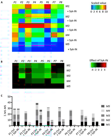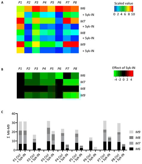 Effect of Syk inhibition on parameters of thrombus formation on immobilized collagen peptides. Blood samples pre-incubated with vehicle (Ctrl) or Syk-IN (20 µM) flowed over microspots M1–5, and the thrombi formed were imaged to obtain parameters P1–8, as in Figure 2. The effects of Syk-IN were assessed per blood sample, surface, and parameter. Mean values from individual blood samples (n = 5–7) were univariate-scaled to 0–10 per parameter across all surfaces M1–9. (A) Heatmap of scaled parameters, demonstrating the mean effects of Syk-IN. The rainbow color code indicates scaled values between 0 (blue) and 10 (red). (B) Subtraction heatmap representing the scaled effects of Syk-IN, filtered for relevant changes (p < 0.05, paired Student’s t-test per surface and parameter). The color code represents decreases (green) or increases (red) in comparison to control runs. (C) Cumulative inhibitory effect per parameter over all microspots, indicating relevant changes.