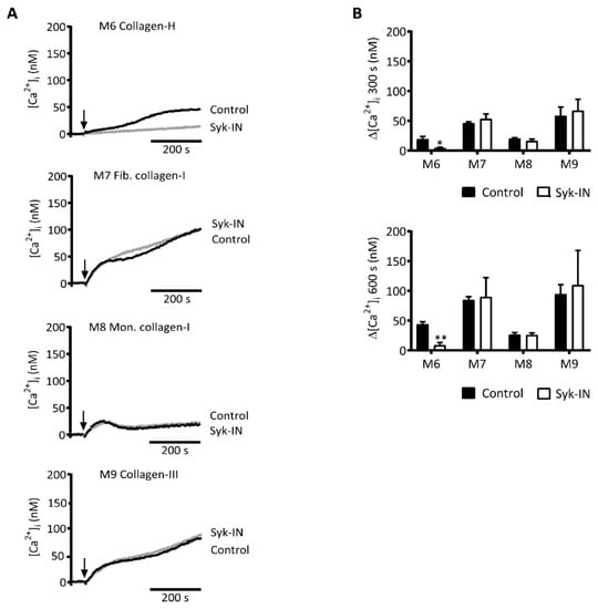 Syk inhibition differently affecting platelet Ca2+ rises by collagens. Fura-2-loaded platelets in 96-well plates were pre-incubated with Syk-IN (5 µM) or were left untreated before stimulation with different collagens (M6–9, 10 µg/mL). Changes in [Ca2+]i were continuously monitored per well-plate row by ratio fluorometry using a FlexStation 3. Collagens were injected at 60 s (arrow), and they reached platelets in a diffusion-limited way. (A) Calibrated [Ca2+]i traces recorded for 600 s in the absence (black, control) or presence (gray) of a Syk inhibitor. Traces are representative of three experiments. (B) Quantification of [Ca2+]i rises after 300 s (top graph) and 600 s (bottom graph) for M1–5. Means ± SEM (n = 3). Paired Student’s t-tests; * p < 0.05, ** p < 0.01.