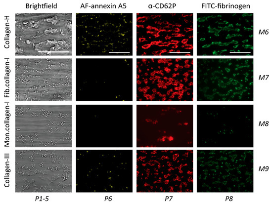 The same collagen preparations (M6–9) were also applied as microspots to test their ability to support thrombus formation under flow. As indicated in Figure 5, collagen-H (M6) was the most potent in provoking the formation of large aggregates of platelets with high PS exposure, granule secretion, and fibrinogen binding, in agreement with the known high GPVI- and α2β1-activating potency of this collagen when immobilized [9,11,12]. In comparison, the fibrillar type I (M7) and III (M9) collagens formed only small aggregates of platelets with remaining secretion and fibrinogen binding, with M9 causing residual PS exposure (Figure 5). The degraded collagen-I (M8) caused mostly single-platelet adhesion with incidental small-sized aggregates. The same information was obtained from the raw mean values of individual parameters with these surfaces (Figure S3).