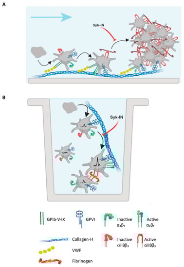 - Siljander, P.R.; Munnix, I.C.; Smethurst, P.A.; Deckmyn, H.; Lindhout, T.; Ouwehand, W.H.; Farndale, R.W.; Heemskerk, J.W. Platelet receptor interplay regulates collagen-induced thrombus formation in flowing human blood. Blood 2004, 103, 1333–1341. [Google Scholar] [CrossRef] [PubMed]