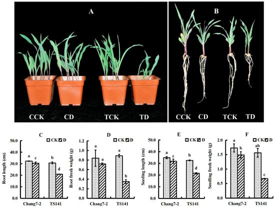 Growth parameters of Chang 7-2 and TS141 seedlings under control and drought-stressed conditions. Data are presented as mean ± standard deviation. Lowercase letters indicate a significant difference at the 1% level. CK: Control; D: Drought stress. CCK: Chang 7-2 control; CD: Chang 7-2 drought stress; TCK: TS141 control; TD: TS141 drought stress. (The same applies in the other tables and figures). (A,B) Performance of Chang 7-2 and TS141 seedlings after exposure to control or drought stress. (C) Root length (cm). (D) Root fresh weight (g). (E) Seedling length (cm). (F) Seedling fresh weight (g). n = 3.