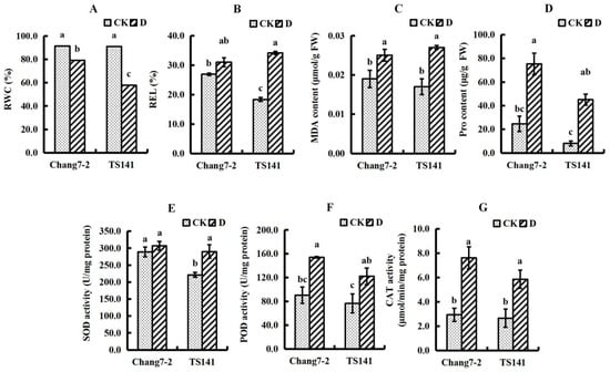Physiological characteristics of Chang 7-2 and TS141 seedling roots under control and stressed conditions. Data are presented as the mean ± standard deviation. Lowercase letters indicate a significant difference at the 1% level. (A) RWC. (B) REL. (C) MDA content. (D) Pro content. (E) SOD activity. (F) POD activity. (G) CAT activity.