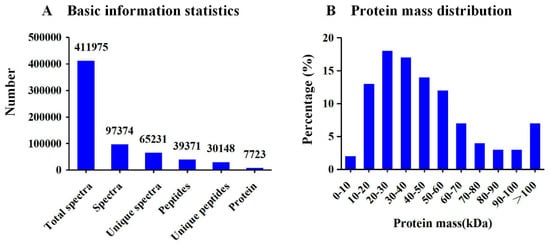 (A) Spectra, peptides, and proteins identified from isobaric tags for relative and absolute quantitation (iTRAQ) proteomics. (B) Molecular weight distribution of the proteins that were identified from the iTRAQ analysis.