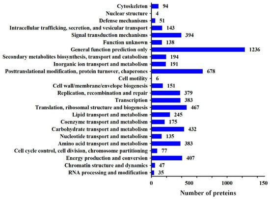 A total of 7723 proteins were identified using iTRAQ in the maize seedling roots (Tables S1 and S2). We detected 97374 spectra (Table S3), 39371 peptides and 30148 unique peptides (Figure 3A). The identified protein molecular mass was mainly distributed between 10–60 kDa (Figure 3B). Cluster of Orthologous Groups of Proteins (COG) analysis divided these proteins into 24 categories, among which general function prediction contained the largest number of proteins (19.1%), followed by posttranslational modification, protein turnover, and chaperones (10.52%) (Figure 4).