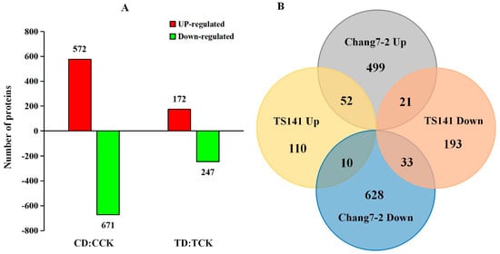 Based on the fold change of > 1.2 (up) or < 0.83 (down) and a p-value < 0.05, 1546 significant DEPs were identified. Compared with the control, there were 1243 DEPs in Chang 7-2 following stress treatment, 572 of which were up-regulated (Table S4) and 671 of which were down-regulated (Table S5). In TS141, 419 DEPs were detected following stress, 172 of which were up-regulated (Table S6) and 247 of which were down-regulated (Table S7, Figure 5A).