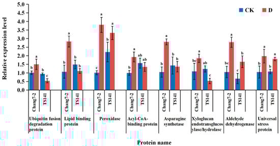 mRNA expression level analysis (qRT-PCR) of eight DEPs under control and stressed conditions. Data are presented as the mean ± standard deviation. Lowercase letters indicate a significant difference at the 5% level.