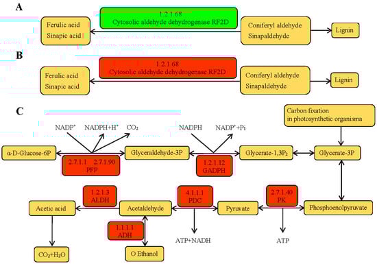 (A) Glycolysis/gluconeogenesis pathway. (B) Phenylpropanoid biosynthesis pathway in CD vs. CCK. (C) Phenylpropanoid biosynthesis pathway in TD vs. TCK. Red boxes represent the up-regulated proteins under simulated drought stress. Green boxes represent the down-regulated proteins under simulated drought stress. Yellow boxes represent metabolites.