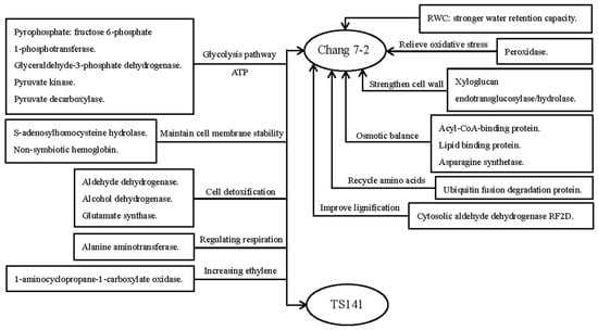 Based on the analysis above, we propose a molecular model for the response of Chang 7-2 to simulated drought stress (Figure 8). The mechanism of Chang 7-2 in response to drought is attributed to: The stronger water retention capacity; the synergistic action of antioxidant enzymes, such as POD, which eliminates harmful free radicals and alleviates oxidative stress; strengthening the cell wall through the up-regulation of xyloglucan endotransglucosylase/hydrolase; the effects of acyl-CoA-binding protein, lipid binding protein, and asparagine synthetase, which can relieve the extravasation of cellular contents, maintain osmotic balance, and stabilize the membrane system of plants. Besides, the increase in ubiquitin fusion degradation protein makes Chang 7-2 more efficient in recycling amino acids from proteins that have been inactivated by drought exposure. A reduction in cytosolic aldehyde dehydrogenase RF2D improves lignification. Furthermore, the two varieties exhibited a common mechanism under drought stress: More energy was produced through the glycolysis/gluconeogenesis pathway and related enzymes, and aldehyde dehydrogenase, alcohol dehydrogenase and glutamate synthase alleviated the toxic effects of the aldehydes and ammonia; maintain cell membrane stability through the effective of s-adenosylhomocysteine and non-symbiotic hemoglobin. Some enzymes also responded to drought stress by regulating respiration and increasing the ethylene content.