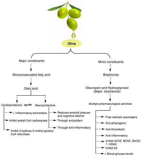 Multiple pharmacological activities (Table 2) have been associated with olive biophenols (oleuropein, hydroxytyrosol, verbascoside, and quercetin) as potent antioxidants [74], which can scavenge superoxide anion, hydrogen peroxide, hypochlorous acid [75], with anti-atherogenic, anti-thrombotic, anti-inflammatory properties [74], and with inhibition the enzymes involved in AD pathogenesis (acetylcholinesterases, butyrylcholinesterases, beta-secretases, histones deacetylases) [99], and reducing Aβ toxicity [100]. Similarly, MedDi biophenols have shown favourable effects in cognitive function through its anti-oxidant capacity [101] and anti-inflammatory properties [102]. MedDi containing biophenols, especially oleuropein and hydroxytyrosol, were significantly inhibited events connected with endothelial activation, including the expression of adhesion molecules such as VCAM-1, E-selectin, and to a lesser extent, ICAM-1 after stimulation with virtually any stimulus able to elicit the coordinated expression of such genes [103] through reduction of reactive oxygen species levels and nuclear factor (NF)-kB nuclear translocation and activation.