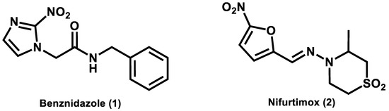 Chagas’ disease, which is a neglected tropical disease (as defined by the World Health Organization, WHO) caused by the protozoan Trypanosoma cruzi, is the leading cause of heart failure in Latin America, where it is endemic [1]. According to the WHO, the disease affects 8 million people worldwide and causes 10,000 deaths every year. Moreover, more than 25 million people live in vulnerable areas under the risk of infection [2]. Current chemotherapy for Chagas’ disease is limited to nifurtimox and benznidazole, which are two obsolete drugs identified in 1965 and 1971, respectively (Figure 1). These nitroheterocyclic compounds cause several adverse effects, such as weight loss, neurological damage, anorexia, dermatitis, depression, nausea, and gastrointestinal problems [3,4]. Furthermore, they lack effectiveness in the chronic phase of the disease. Given these drawbacks, novel, effective, and safe drugs for Chagas’ disease are urgently needed [5].