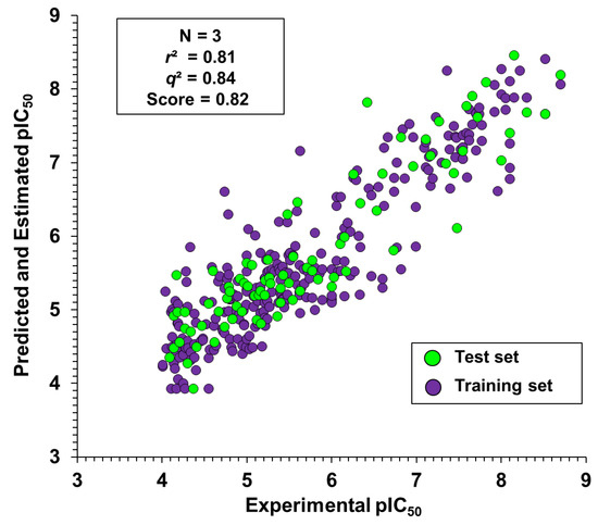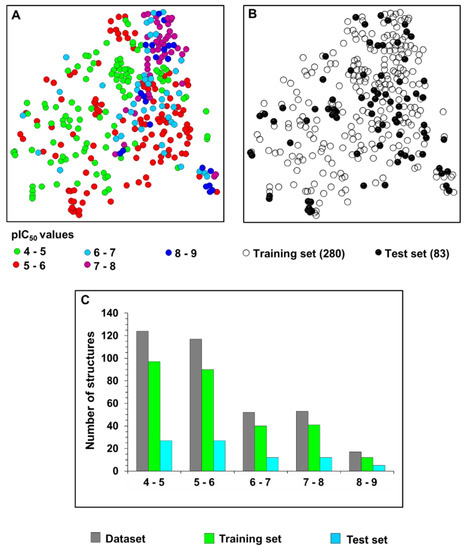 To characterize the structural and activity landscape of the dataset, we carried out a principal component analysis (PCA) using SYBYL-X 2.0 and UNITY fingerprints as molecular descriptors (Certara, Princeton, NJ, USA) [67,68]. The PCA result was converted into a structure similarity map that provides information on the structure and activity profiles of the dataset. To generate the structure similarity map, two principal components were initially extracted and applied as initial coordinates of the map. Next, Tanimoto distances between the molecular fingerprints were computed to plot all points of the map. Based on the structure similarity map, we selected the training (280 structures) and test (83 structures) sets to run the QSAR analyses. The training and test set molecules are available in the supporting information (Table S1).