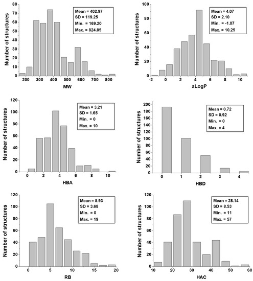 Distribution of physicochemical properties for the dataset. Note: MW = molecular weight; aLogP = logarithm of the octanol-water partition coefficient; HBA = hydrogen bond acceptors; HBD = hydrogen bond donors; RB = number of rotatable bonds; HAC = heavy atom count; SD = standard deviation.