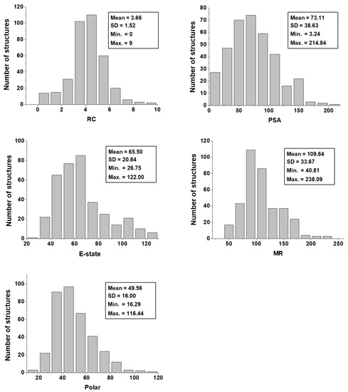 Physicochemical characterization of the dataset. Note: RC = ring count; PSA = polar surface area; E-state = electrotopological state; MR = molar refractivity; Polar = molecular polarizability; SD = standard deviation.