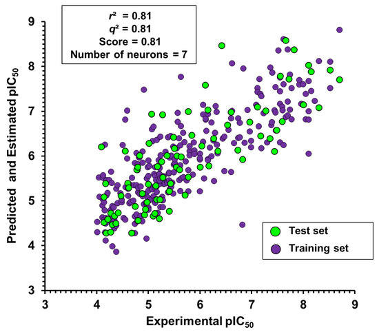 The statistical indicators shown in Table 3, particularly the correlation coefficient for the test compounds (q² = 0.81), show the ability of the best ANN model to predict the trypanocidal activity of novel and structurally diverse compounds. The good agreement between the experimental and predicted pIC50 values exhibited by this model is graphically illustrated in Figure 5 for the training and test set compounds.