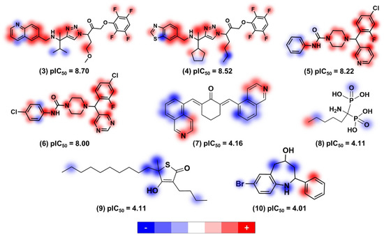 KPLS models can be assessed for favorable and unfavorable structural characteristics through the generation of atomic contribution maps. Hence, the most relevant structural features for the trypanocidal activity were investigated by generating contribution maps based on the best KPLS model (molprint2D, Table 5). Positive, neutral, and negative contributions are depicted in red, white, and blue, respectively, and the color intensity shows the magnitude of the effect (Figure 7). Overall, heterocyclic aromatic rings contributed positively to activity. Aliphatic hydrocarbon chains showed negative or no influence for most compounds. Halogen substituents showed the full range of contributions—fluorine contributed positively, chlorine and iodine had no influence, and bromine contributed negatively. In general, hydroxyl groups were unfavorable, and piperazine rings were demonstrated to be favorable.