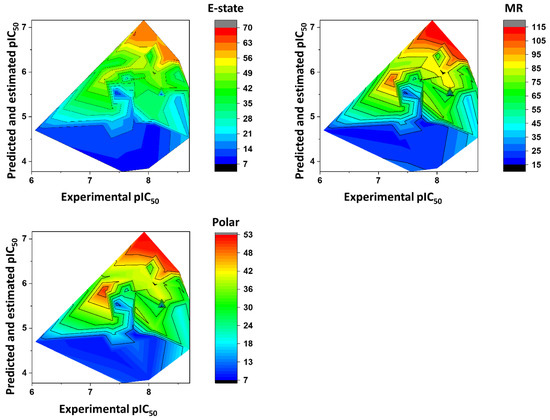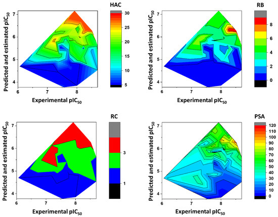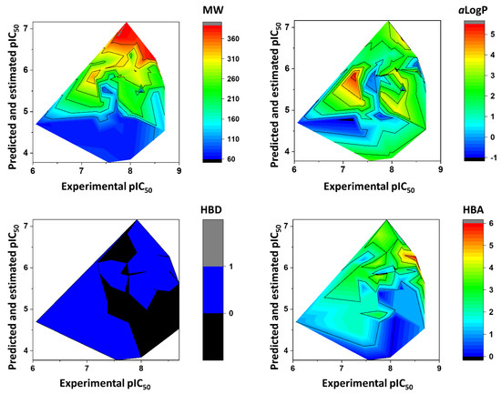 Twenty-nine active compounds with pIC50 > 6 (see Table S1 for the structures) were selected to construct a collection of 50 fragments. Only molecular fragments that were predicted to enhance the trypanocidal activity (red areas of the contribution maps) were considered in this analysis. Next, physicochemical descriptors were calculated for these fragments and used as an input for the best ANN with the view of predicting their biological activity. Finally, the predicted activity values were correlated with each physicochemical property of the fragment collection. The outcome of this analysis is illustrated as heat maps (Figure 8, Figure 9 and Figure 10), which allowed us to identify a specific physicochemical space that favors trypanocidal activity. The heat maps also correlate the activity of the compounds from which the fragments were extracted and their physicochemical profile.