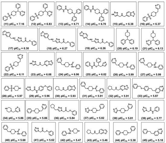 Figure 11 shows the structure and biological activity of 35 fragments that were predicted to be the most promising according to their trypanocidal profile. This group is characterized by a diversity of chemical motifs having two to four rings with the predominant groups being pyridine, pyrimidine, benzene, piperazine, triazole, benzothiazole, benzofuran, oxadiazole, and pyrazolopyrimidine. The four most active fragments from this collection have a phenylsulfonyl-piperazine (fragments 11 and 12) or a phenylpiperazine-carboxamide moiety (fragments 13 and 14) linked to two aromatic rings that are either pyridine, pyrimidine, or benzene. Replacing one of these aromatic rings with a hydrogen, such as in 16 and 22, led to a reduction of the biological activity. The same effect was observed for 24 and 27, in which one aromatic ring was kept and the benzene was replaced with a hydrogen. The replacement of the pyridine in compound 20 with a pyrimidine in compound 21 led to a subtle lowering of the pIC50 value. Another substitution that affected the biological activity was the exchange between the benzofuran, benzothiazole, and pyrazolopyrimidine in fragments 17, 18, and 19. Among these three compounds, the benzofuran derivative was the most potent. Furthermore, replacing the pyrazolopyrimidine in compound 23 with a benzothiazole in compound 15 increased the trypanocidal activity.