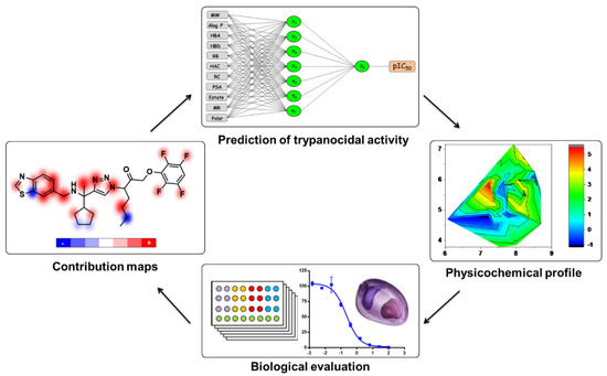 Proposed workflow for the design of novel anti-Trypanosoma cruzi compounds based on the generation of contribution maps, prediction of trypanocidal activity using artificial neural networks, and analysis of physicochemical properties. Compounds featuring favorable properties can be synthesized and evaluated against the parasite.