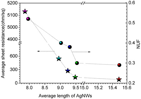 - Yang, X.; Du, D.X.; Wang, Y.H. Length-dependent electro-optical properties of silver nanowires-based transparent conducting films. J. Mater. Sci. Mater. Electron. 2019, 30, 6838–6845. [Google Scholar] [CrossRef]