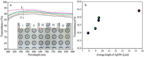- Sorel, S.; Lyons, P.E.; De, S.; Dickerson, J.C.; Coleman, J.N. The dependence of the optoelectrical properties of silver nanowire networks on nanowire length and diameter. Nanotechnology 2012, 23, 185201. [Google Scholar] [CrossRef] [PubMed]