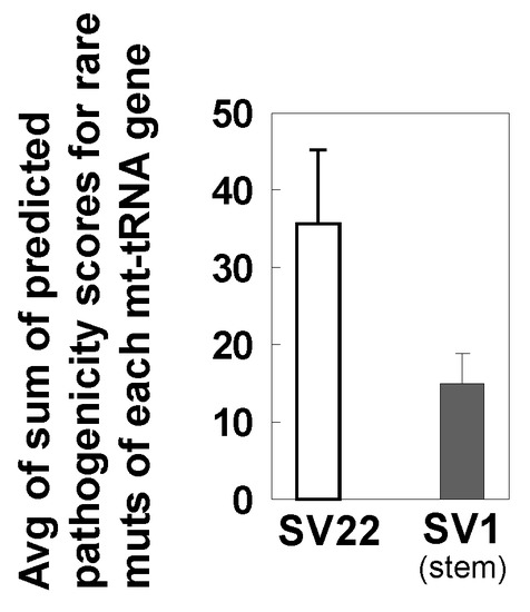2.9. Predicted Pathogenicity Scores of Rare Mutations of Mitochondrial tRNA Genes Tend to be Lower in SV1 Cells than in SV22 Cells.