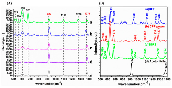 In this paper, a 10 mg/L solution of CPF (C9H11Cl3NO3PS) was chosen to estimate the SERS activity and stability of different AuNP substrates. Moreover, for confirming the accuracy of SERS spectra, the Raman spectral simulations were carried out based on density functional theory (DFT) with the assistance of Gaussian v.09 software [27]. The SERS spectra of CPF at 10 mg/L with the different AuNPs is shown in Figure 1A. The Raman spectral simulation with DFT calculations, the Raman spectra of CPF powder, the SERS spectra of CPF and Raman spectra of acetonitrile are shown in Figure 1B. In addition, the vibrational mode of the various peaks of CPF is shown in Table 2. It can be clearly seen in Figure 1B that, except for 922 and 1374 cm−1 assigned to acetonitrile, the SERS characteristic peaks were basically consistent with those of CPF powder calculated by DFT, which indicated that the SERS spectra were accurate and reliable.