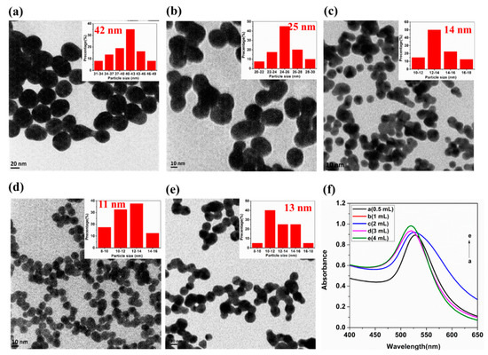 Representative transmission electron microscopy (TEM) images of AuNPs with 0.5 mL Na3C6H5O7 (a), 1 mL Na3C6H5O7 (b), 2 mL Na3C6H5O7 (c), 3 mL Na3C6H5O7 (d), and 4 mL Na3C6H5O7 (e), respectively. (f) The UV–vis spectrometry of AuNPs.