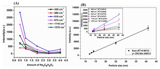 As shown in Figure 3, with the increase of Na3C6H5O7 from 0.5 to 4 mL, the SERS intensity of CPF at 529, 560, 610, 674, 1100 and 1270 cm−1 decreased gradually. There were good linear correlations between the SERS characteristic peak intensity at 529, 560, 610, 674, 1100 and 1270 cm−1 of the CPF molecule and AuNP diameters with an R2 of 0.9913, 0.8200, 0.9778, 0.9727, 0.8197 and 0.9655, respectively. In addition, the value of R2 reached 0.9973 between the sum of the SERS characteristic peak intensities and AuNP diameters. The reason might be that when the AuNP diameters were the largest (42 nm in this study), the electric field force among the AuNPs was the strongest and the effects of “hot spots” among the largest AuNPs also reached the strongest, resulting in the strongest SERS signal of CPF [29]. In further study, the AuNPs prepared by 0.5 mL trisodium citrate with a good enhancement effect were selected as the SERS substrates to detect CPF residues in soil.