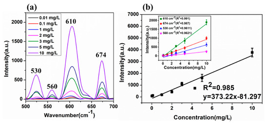 (a) The Raman spectra of CPF with AuNPs at different concentrations ranging from 0.01 to 10 mg/L. (b) A linear equation of Raman characteristic peak intensity and its concentration at 530, 560, 610, 674 cm−1 of the CPF molecule.