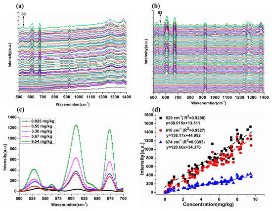 It can be clearly seen that there was a baseline shift in the original spectra of CPF in soil (Figure 5a). Following the baseline correction (BC), with an increase of CPF concentration in soil from 0.025 to 9.54 mg/kg, the intensity of CPF characteristic peaks at 529, 610 and 674 cm−1 increased gradually (Figure 5c), which indicated that the SERS technique could be used for the quantitative determination of CPF in soil, and the characteristic peaks located at 529, 610 and 674 cm−1 of CPF molecules were still identified even when the solution concentration was as low as 0.025 mg/kg below the national standard for soil environmental quality (0.05 mg/kg). However, there is still room for the improvement of LOD for reaching the μg/kg level. For the quantitative detection of CPF in soil, the linear fit calibration curves based on 83 spectra were used and the value of R2 at 529, 610 and 674 cm−1 intensity reached 0.9286, 0.9327 and 0.9393, respectively (Figure 5d). The results proved that CPF residues in soil could be quantitatively determined by the SERS technique. Moreover, it can be seen that the R2 of CPF in soil at 529, 610 and 674 cm−1 were lower than the CPF in different concentrations. This might due to the influence of soil background matrix.