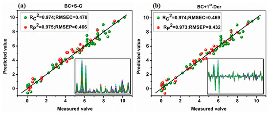 The prediction effect of the PLSR model with different spectral preprocessing methods: (a) the SERS spectra processed with BC and S-G treatment; (b) the SERS spectra processed with BC and 1st-Der treatment.