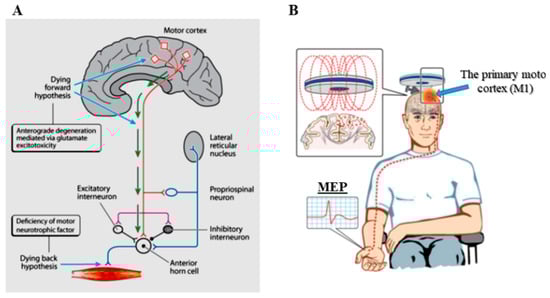 (A) The three theories for ALS onset are illustrated. The dying forward hypothesis proposes that ALS is primarily a disorder of the corticomotoneurons (red colour), which connect monosynaptically with the anterior horn cells, and mediate anterograde motor neuron degeneration via glutamate excitotoxicity. In contrast, the dying back hypothesis proposes that ALS begins within muscles or at the neuromuscular junction, with noxious factors transported retrogradely from the periphery to the axon cell body, where they exert toxic effects. The independent degeneration hypothesis proposed that upper and lower motor neuron degeneration occurs independently. (B) Transcranial magnetic stimulation excites neurons in the underlying motor cortex, with motor evoked potentials (MEP) recorded over the contralateral muscle. It is a sensitive measure of cortical excitability.