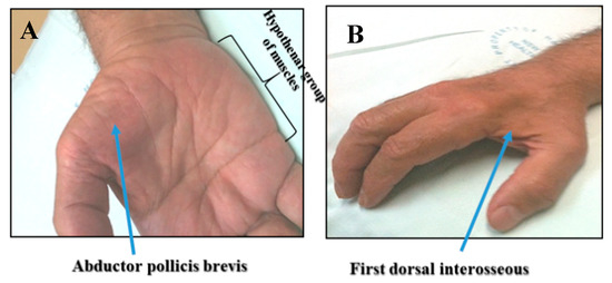 Dissociated muscle atrophy is a specific feature of ALS, characterized by preferential wasting of the (A) abductor pollicis brevis and (B) first dorsal interosseous muscles, when compared to the hypothenar group of muscles.