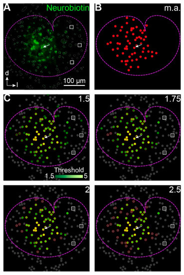 Confocal images were processed using Fiji software [37]. Since not only the tracer-coupled network but also cells that express endogenously biotin promote avidin signals, a semiautomated intensity-based cell detection method was applied to decide objectively which of these cells part of the tracer-loaded network were. At first, all identified cells were marked as a region of interest (ROI) with the oval brush selection tool (gray circles and ellipses in Figure 2A). The ROI manager was then used to measure the mean gray values and the x- and y-coordinates. Then, three of these cells, which were distant from the patched cell but still inside of the LSO borders, were chosen (white squares in Figure 2A,C). The mean gray values of these three ROIs correspond to the background intensity. For subsequent analysis of the tracer-coupled networks, cells that exhibited a signal with intensity 1.75 times the intensity background level were chosen.