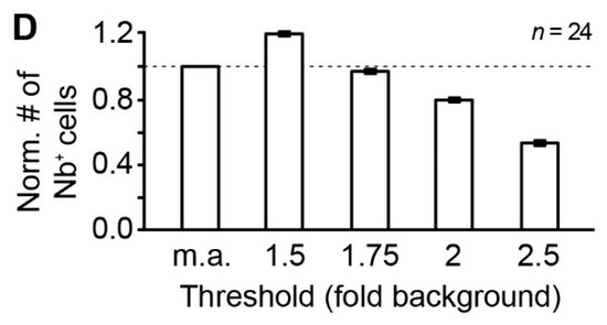 The unambiguous identification of tracer-filled cells represents a difficult task. The tracer signal exponentially declines from the center to the edge of the tracer-coupled network (Figure 1, Figure 2 and Figure 3) [4,5]. Especially at the borders of tracer-coupled networks, it is difficult to decide whether a cell displays a true tracer signal. Such manual decision can easily lead to over- or underestimation of the number of coupled cells. Furthermore, like the tracer neurobiotin, endogenous biotin is detected by avidin, causing elevated background levels (Figure 2) [21]. Astrocytes lacking tracer coupling are found in the LSO and further brain regions [4,5,11]. Furthermore, NG2 cells might be present in the LSO. Although they show panglial coupling with astrocytes in the corpus callosum [6], they were found in many brain regions to be neither tracer nor electrically coupled [8,11,26,27,28]. These predominantly uncoupled cells might express low amounts of biotin. In turn, cells might be assigned to the network just due to background labeling in previous analyses [4,5,11]. In this study, a semiautomated intensity-based cell detection method was used to overcome this problem. Only cells that exhibited an intensity 1.75-fold higher than the background were chosen as a part of the tracer-network.