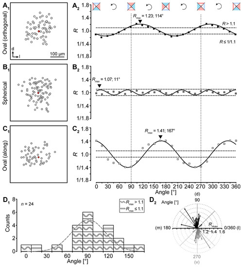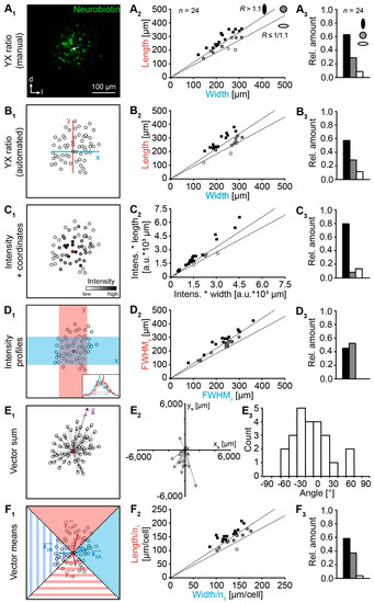 The most often used approach for the analysis of network anisotropy is to calculate the ratio R by dividing the extension of two orthogonal directions y and x (Equation (1); Figure 3A1) [4,5,10,11,15]: