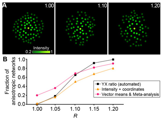 Analysis of in silico networks. (A) Artificially generated networks with R = 1.00 (left), 1.10 (middle), and 1.20 (right). Dots are color-coded corresponding to the fluorescence intensity of each cell (see scale bar). (B) Fraction of anisotropic networks determined with different approaches. For each R-value, 50 artificial networks were generated.