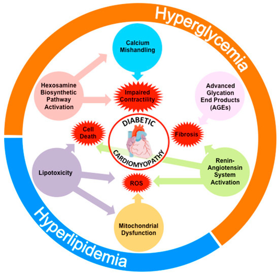 DCM is characterized by functional and structural changes in the heart of diabetic patients. At the functional level, patients with DCM exhibit early development of left ventricular diastolic dysfunction, featured by a reduction in the left ventricle filling velocity and delayed relaxation pattern. Left ventricle systolic dysfunction, being recognized by diminished ejection fraction, develops later as the disease progresses. Patients with DCM also show left ventricular hypertrophy, often accompanied by fibrosis. Interstitial fibrosis increases in parallel to the progression of the disease as a result of the replacement with the connective tissue of cardiomyocytes that have died from apoptosis and/or necrosis [10,11]. The developed fibrosis contributes to cardiac stiffness and impaired contractility of the heart. Another common feature of the heart of patients with DCM is cardiac steatosis [11], an abnormal accumulation of triglycerides in the myocardium that reflects the metabolic derangements occurring in cardiomyocytes of DCM patients (discussed in Section 3.1.3).