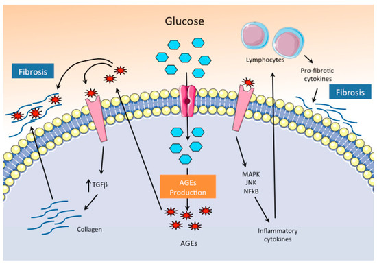 AGEs mostly consist of proteins, but also lipids and nucleic acids that have been glycated by the non-enzymatic action of reducing sugars. Secondary to the hyperglycemia that characterizes uncontrolled diabetic patients, AGEs promote the crosslinking of collagen and other extracellular matrix proteins, impairing their normal degradation (Figure 2). The changes in the mechanical properties of the extracellular matrix proteins lead to increased fibrosis and myocardial stiffness [17]. Furthermore, the interaction of AGEs with specific receptors (RAGEs) leads to enhanced expression of collagen and other extracellular matrix proteins through the upregulation of TGFβ, contributing by this means to the exacerbation of the cardiac dysfunction induced by fibrosis. In addition, AGEs induce the expression of their specific RAGEs receptors, and generate a positive feedback loop that exacerbates the negative impact of AGEs on cardiac function. AGEs-RAGE signaling also activates a pro-inflammatory response through MAPK, JNK, and NF-kB that leads to the recruitment and activation of T helper lymphocytes and induces the production of pro-fibrotic cytokines, favoring interstitial fibrosis and impairing diastolic function [18]. The relevant contribution of AGEs to the etiopathogenesis of DCM has been demonstrated by the use of molecules with RAGE antagonistic activity, which were able to improve the systolic function and reduce the expression of pro-fibrotic proteins in a mouse of type 2 diabetes associated with obesity [19].