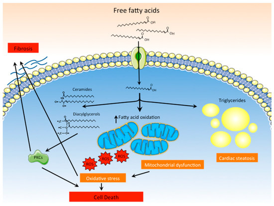 As previously mentioned, DCM is often associated with the accumulation of lipids in the myocardium. The cardiac steatosis observed in diabetic patients and animal models of DCM is the result of increased fatty acid uptake and storage under the form of triglycerides (Figure 3). Intracellular lipid accumulation is unequivocally favored by the hyperlipidemic milieu that characterizes diabetes, which results from enhanced hepatic lipid synthesis and uncontrolled lipolysis in adipose tissues. Although triglyceride accumulation within cardiomyocytes is the most evident and detectable manifestation of intracellular lipid accumulation, lipotoxicity cannot be attributed to triglycerides themselves but to the accumulation of noxious lipid intermediates, such as ceramides, diacylglycerols or acylcarnitines [26,27]. The accumulation of these lipid species promotes mitochondrial dysfunction, endoplasmic reticulum stress or apoptosis by mechanisms that are not fully understood. For instance, ceramides and diacylglycerols have been shown to activate different protein kinase C isoforms, like PKCβ, PKCδ, or PKCθ. Activation of PKCs-mediated signaling pathways promotes inflammation, fibrosis or cell death, all of which have been shown to contribute to cardiac dysfunction [28]. Excessive lipid uptake by the myocardium also alters cardiomyocyte metabolism, favoring fatty acid oxidation in detriment of glucose as the main energetic substrate [29]. The increased flux of fatty acids into the mitochondria for their oxidation results in uncoupling of mitochondria and excessive production of ROS (see Section 3.1.4), which promote cell death and contribute to cardiac dysfunction [30].