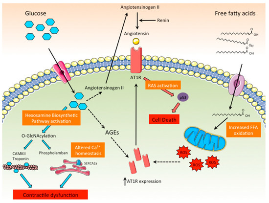 Diabetes activates local RAS by different means (Figure 4). It has been demonstrated that hyperglycemia can directly stimulate the production of angiotensin II in cardiomyocytes, an effect that contributes to cardiomyocyte death by apoptosis through the activation of p53 [45,46]. In addition, diabetes exacerbates the expression of angiotensin receptor 1 (AT1R) in heart, amplifying the activation of RAS signaling in cardiomyocytes [47]. Other indirect mechanisms by which diabetes increases the activity of cardiac RAS are related to dyslipidemia and the exacerbated production of AGEs and ROS associated with diabetes, all of which stimulate the cardiac RAS pathway by up-regulating AT1R expression [48]. Although most of the experimental evidence linking abnormal RAS activation with DCM has been obtained in rodent models of diabetes, the significant improvement of left ventricle hypertrophy and systolic function in diabetic patients treated with the RAS antagonist aliskiren, a renin inhibitor, clearly supports the notion that RAS activation is a major contributor to the pathogenesis of DCM [49,50].