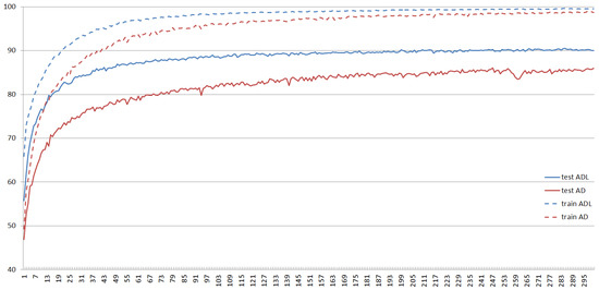 In this experiment, we use the proposed model with three feature sets , , (ADL-DCNN) compared with the model of two features , (AD-CNN [33]). Because we employ two architectures (Architecture 1 and Architecture 2) of CNN to train and test the same data, respectively, when the training feature sets are the same, the result of different architectures can be compared each other. Likewise, in the same architecture, we can compare the predictions results of the model ADL-DCNN and AD-CNN.