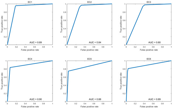 We use receiver operating characteristic (ROC) curves and area-under-the-curve (AUC) values to further assess the performance of the DCNN model, as shown in Figure 3. The assessment method is performed based on the final decision scores in classification scheme. The ROC curve is produced by the cross-validation experiments. Figure 3 shows ROC curve and AUC value of each class. The ordinate represents the true positive rate and the abscissa denotes false positive rate.