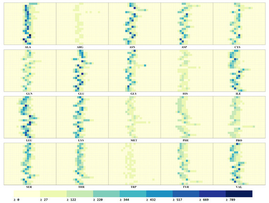 In Figure 5, the horizontal and vertical axes at each plot correspond to and angles and vary from (top left) to (right bottom). For arbitrary amino acid, navy blue indicates a large number of occurrences of the specific value