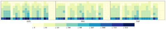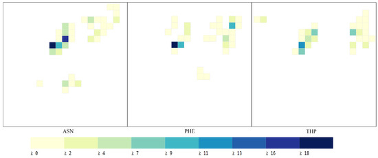 The structural information of protein is represented by the angle and the distance of amino acids. In Figure 5, three amino acids (ASE, PHE, THP) are taken as an example. Figure 5 shows 2D histogram of torsion angles () for each amino acid. The angular distribution of feature map is showed in Figure 5 for the three randomly selected amino acid. Examples of features maps representing amino acid distances () are illustrated in Figure 6, and the range of the vertical axes at each plot is [5,40]. Figure 6 has been produced by selecting the same amino acids as in Figure 5 for ease of comparison of the different feature representations. It can be seen that the distances between the amino acids in the title and 23 amino acids are concentrated in the last bin, corresponding to high distances.