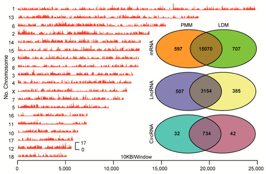 The distribution of sequenced reads and expressed transcripts in muscles. The left panel represented genome-wide distribution of sequenced reads in pig chromosomes. The right panel of Venn diagrams represented all the numbers of expressed mRNAs, lncRNAs, and circRNAs between LDM and PMM.