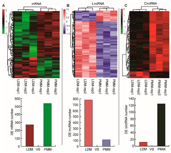 Hierarchical clustering analysis for differentially expressed (DE) mRNAs (A), lncRNAs (B), and circRNAs (C) between LDM and PMM.